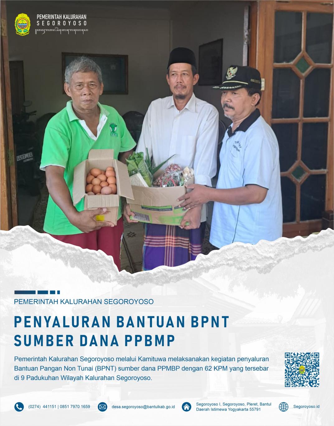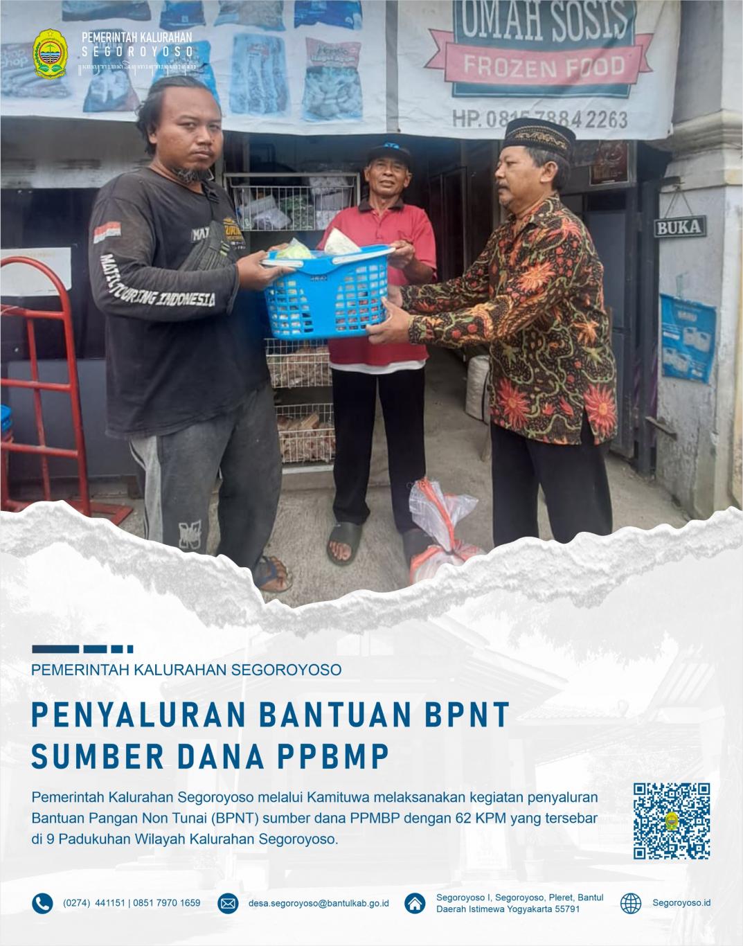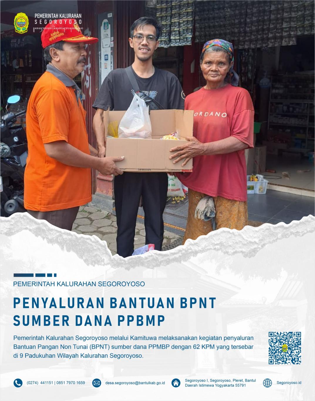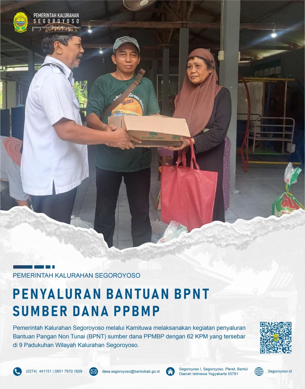 Segoroyoso (20/4) - Pemerintah Kalurahan Segoroyoso melaksanakan penyerahan BPNT yang bersumber dana PPBMP kepada masyarakat yang diterima langsung oleh KPM. KPM adalah warga miskin yang layak menerima bantuan, namun belum mendapatkan bantuan sosial apapun. Sehingga dicover sebagai penerima BPNT PPBMP.#r-na