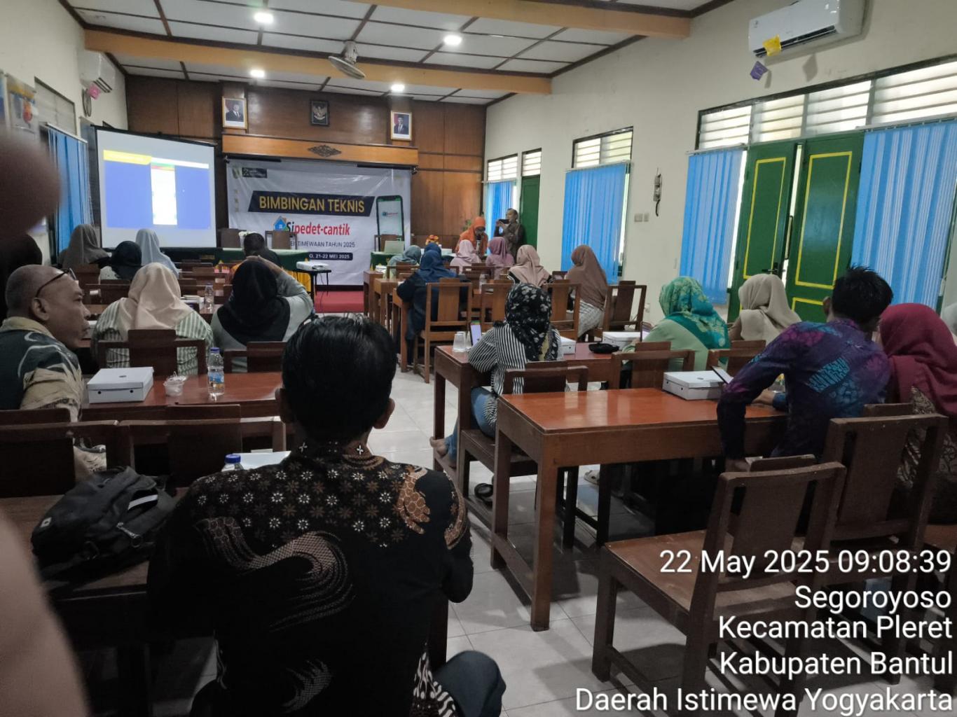 Segoroyoso (22/05) – Bertempat di aula Balai Kalurahan Segoroyoso dilaksanakan bimbingan teknis Sipedet Cantik bagi PPL dan PML selama 2 hari yakni Rabu dan Kamis 21 sampai 22 Mei 2025. Hadir dalam kesempatan tersebut Kepala Dinas Sosial Kabupaten Bantul Gunawan Budi Santoso, S.Sos., MH, Kepala Jawatan Kemakmuran Kapanewon Pleret, Lurah Segoroyoso, serta peserta bimbingan teknis. Adapun nara sumber adalah dari BPS Propinsi Daerah Istimewa Yogyakarta Jafar Nawawi, S.Si., M.Si. dan Evi Wahu Pratiwi, S.ST., M.STAT.